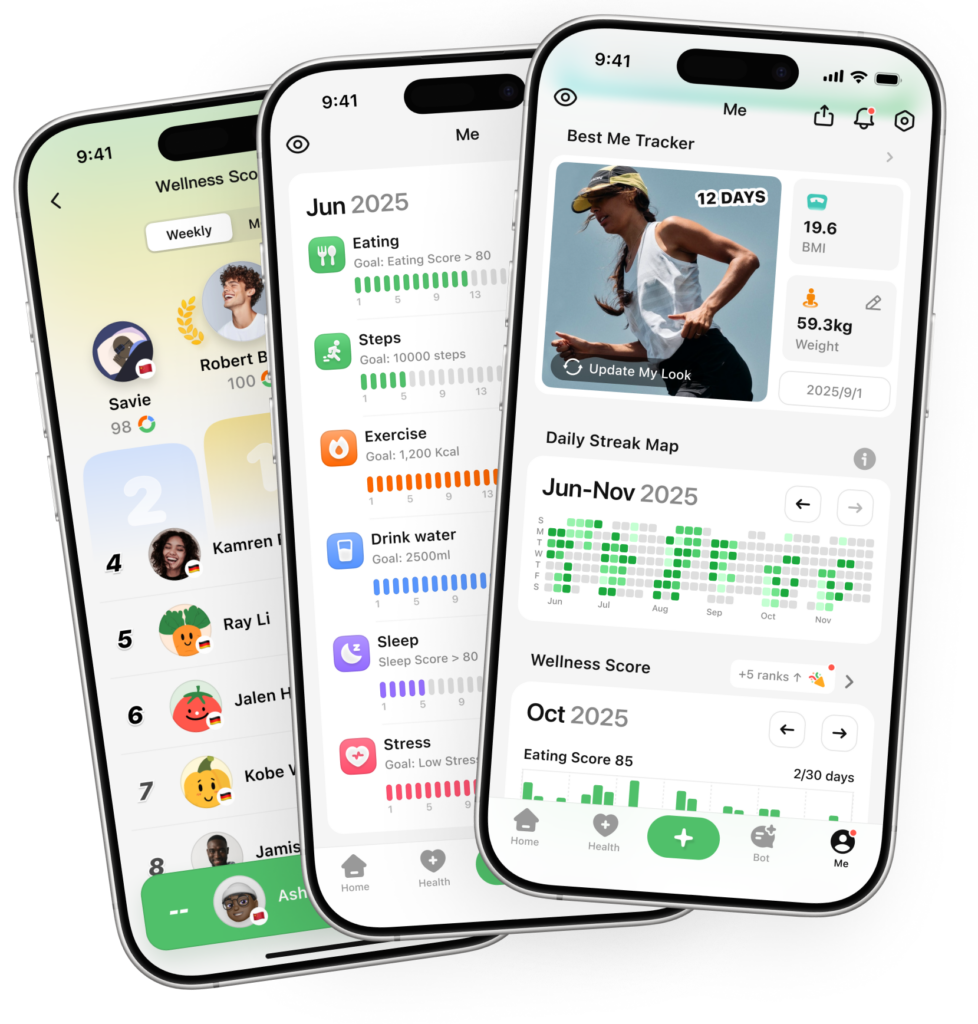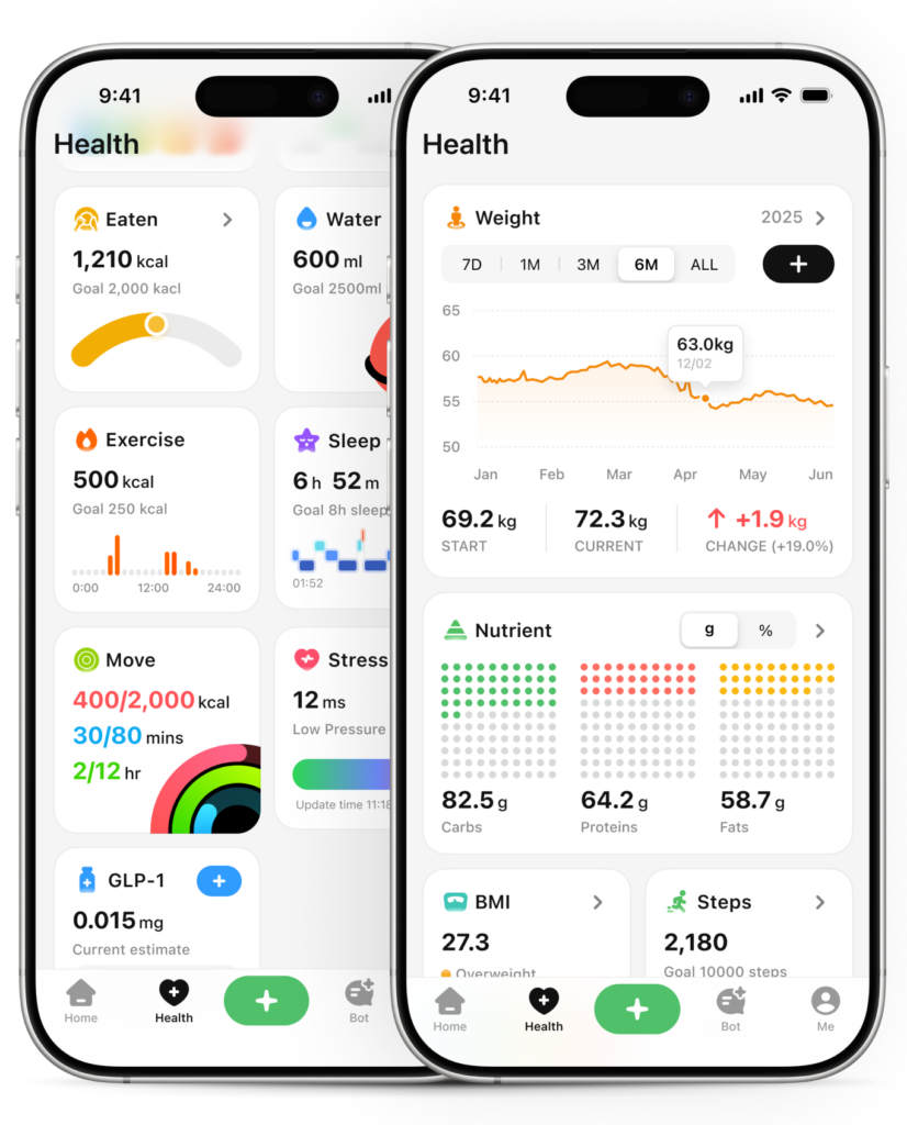 TrackUp’s Wellness Score gives you a clear signal of your overall health trend, based on nutrition quality, activity, sleep, and balance — not calories alone.