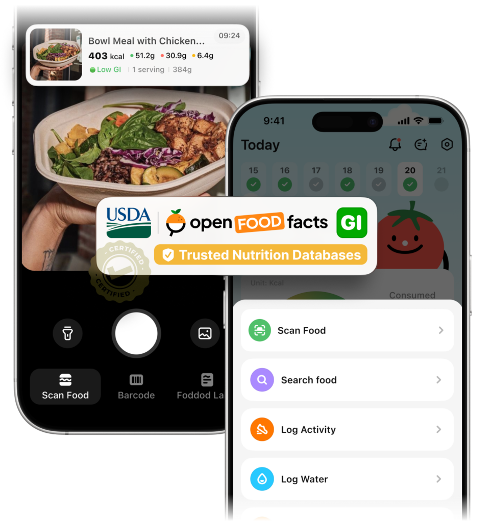 AI helps recognize foods — nutrition values are structured and reviewed, not AI-generated.