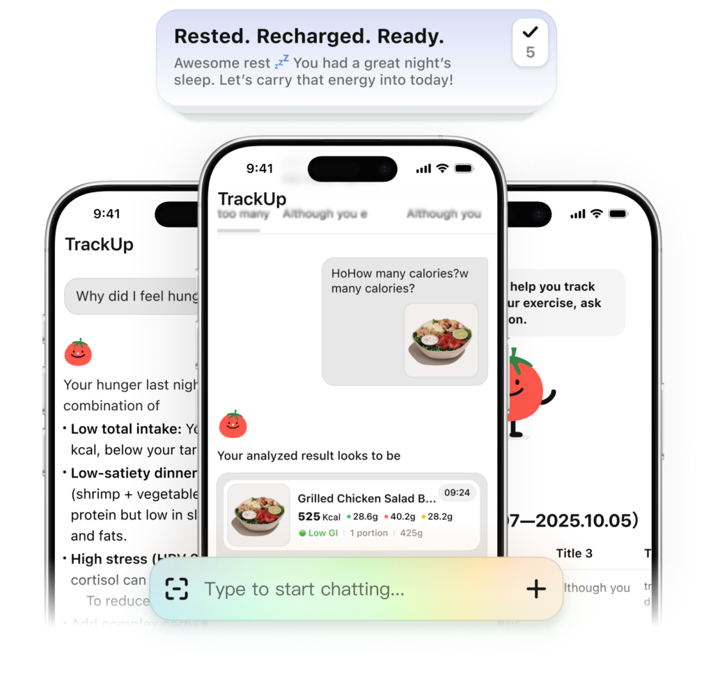 Calories are just one part of the picture. TrackUp focuses on context — how food, activity, sleep, and stress interact over time.